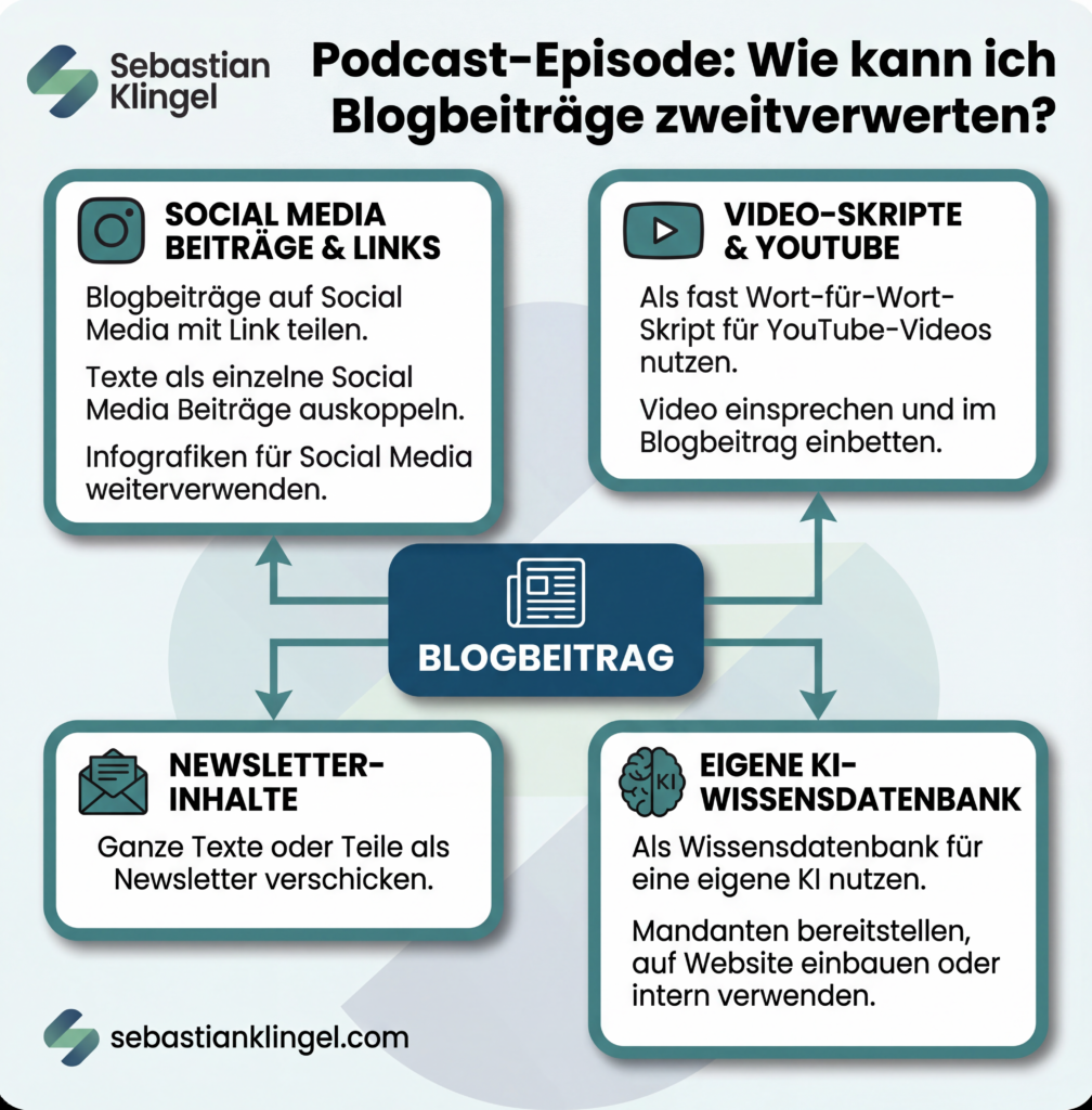 Herzlich willkommen zu einer neuen Episode des Kanzleimarketing-Podcasts. Heute habe ich eine Frage mitgebracht, und zwar die Frage: Wie kann ich denn Blogbeiträge zweitverwerten? Falls du auch eine Frage an mich hast, kannst du die mir gerne auf LinkedIn zuschicken, per E-Mail oder direkt unter „sebastianklingel. Com/frage-stellen-einreichen. Und ja, wenn es passt, wie gesagt, dann würde ich diese auch im Podcast einmal beantworten. Zurück zur Frage aber: Wie kann ich denn jetzt Blogbeiträge weiterverwerten? Sprich, du hast ja einmal die Mühe gemacht, hast einen ausführlichen guten Blogbeitrag geschrieben und damit schon einen sehr, sehr guten und richtigen Gedanken, weil du kannst das Ganze einfach weiterverwenden und einfach noch mal nutzen. Folgende Punkte würde ich vor allem empfehlen als Zweitverwertung. Es sind im im Prinzip vier Bereiche: Social Media, YouTube, Newsletter und KI. Ich würde jetzt einfach mal Schritt für Schritt durchgehen. Für alle, die das Ganze hier als Videopodcast auch sehen, die sehen hier ein kleines Schaubild. Ansonsten für alle, die hier zuhören, einfach weiter zuhören. Ich bespreche alles Schritt für Schritt. Schritt eins oder Punkt eins ist Social Media. Also je nach Themengebiet, je nach Zielgruppe, häufig bietet sich LinkedIn an, weil LinkedIn einfach sehr textbasiert auch nach wie vor ist.